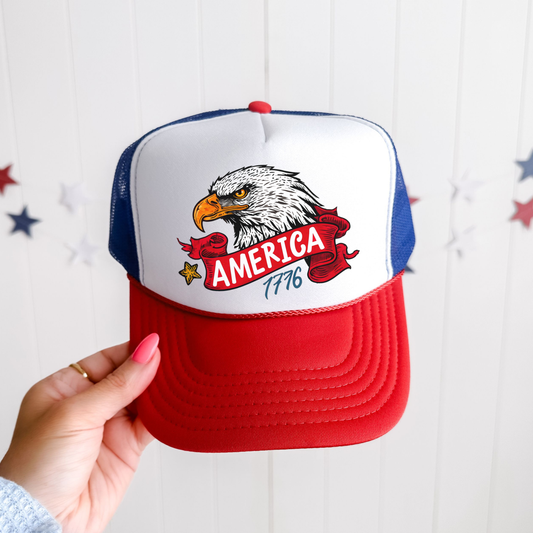 America 1776 Trucker Hat 🦅 Bold Bald Eagle Patriotic Cap