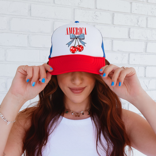 America Cherry Trucker Hat 🍒 Patriotic Coquette Snapback