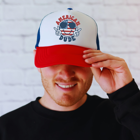 American Dude Trucker Hat 😎 Patriotic Peace Sign Snapback