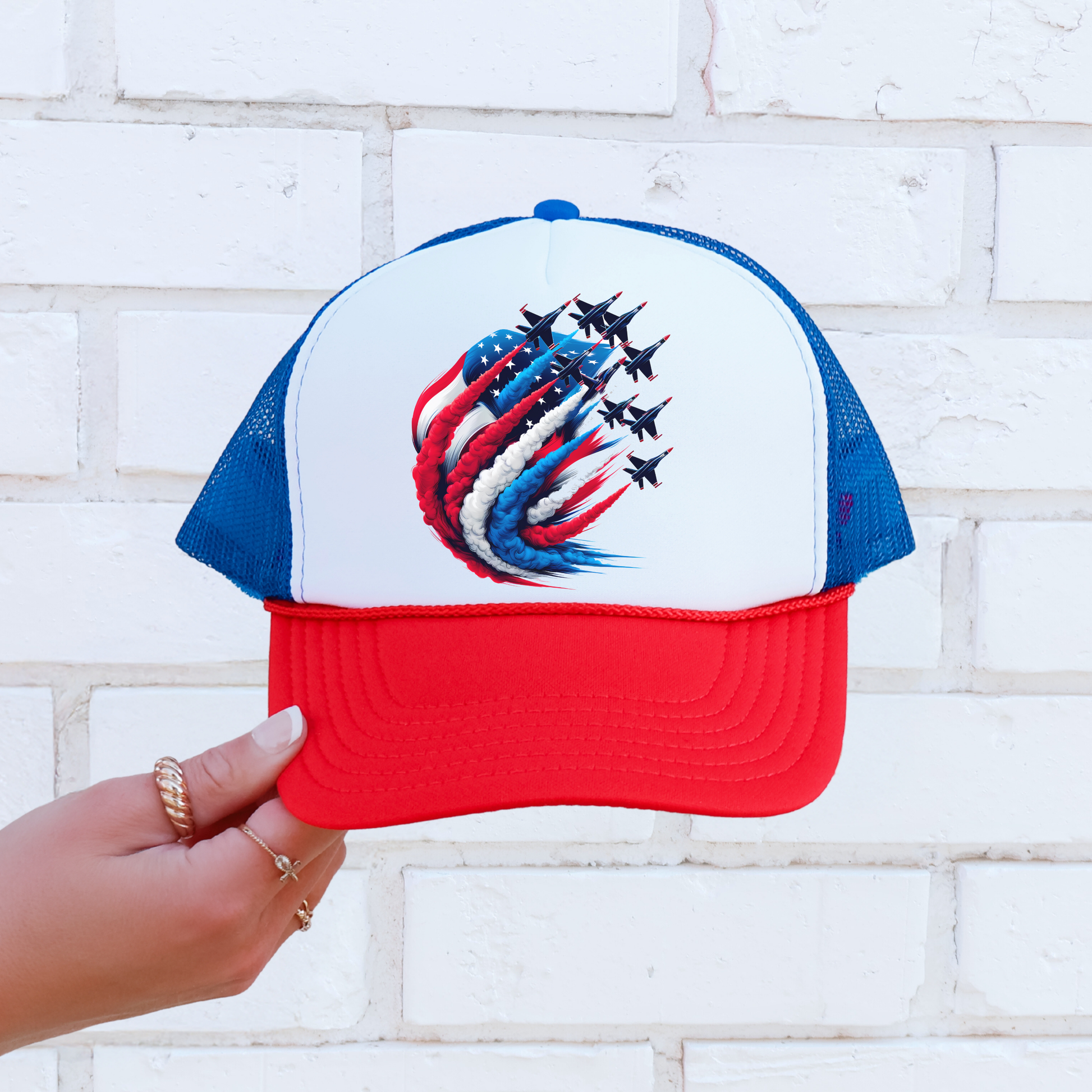 This bold foam trucker hat features a stunning fighter jet formation with red, white, and blue smoke trails — perfect for the 4th of July, Memorial Day, or showing off your love for freedom and flight.